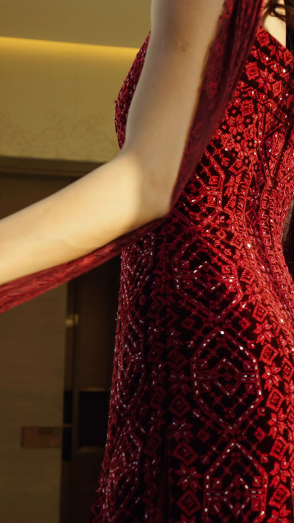 Velvet Maroon Banayek Gown With Lace